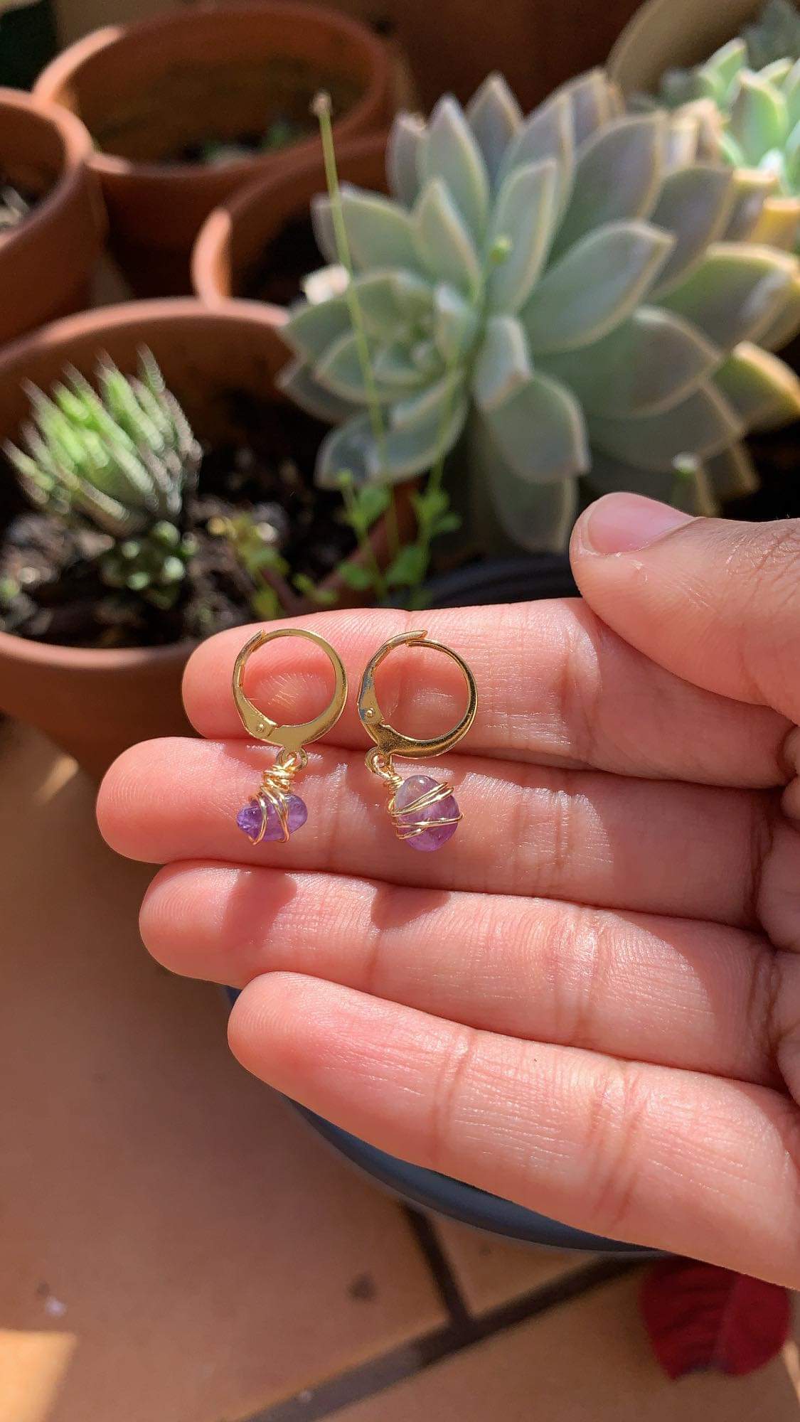 Material: stainless steel huggies, natural amethyst chip, non tarnish wire.