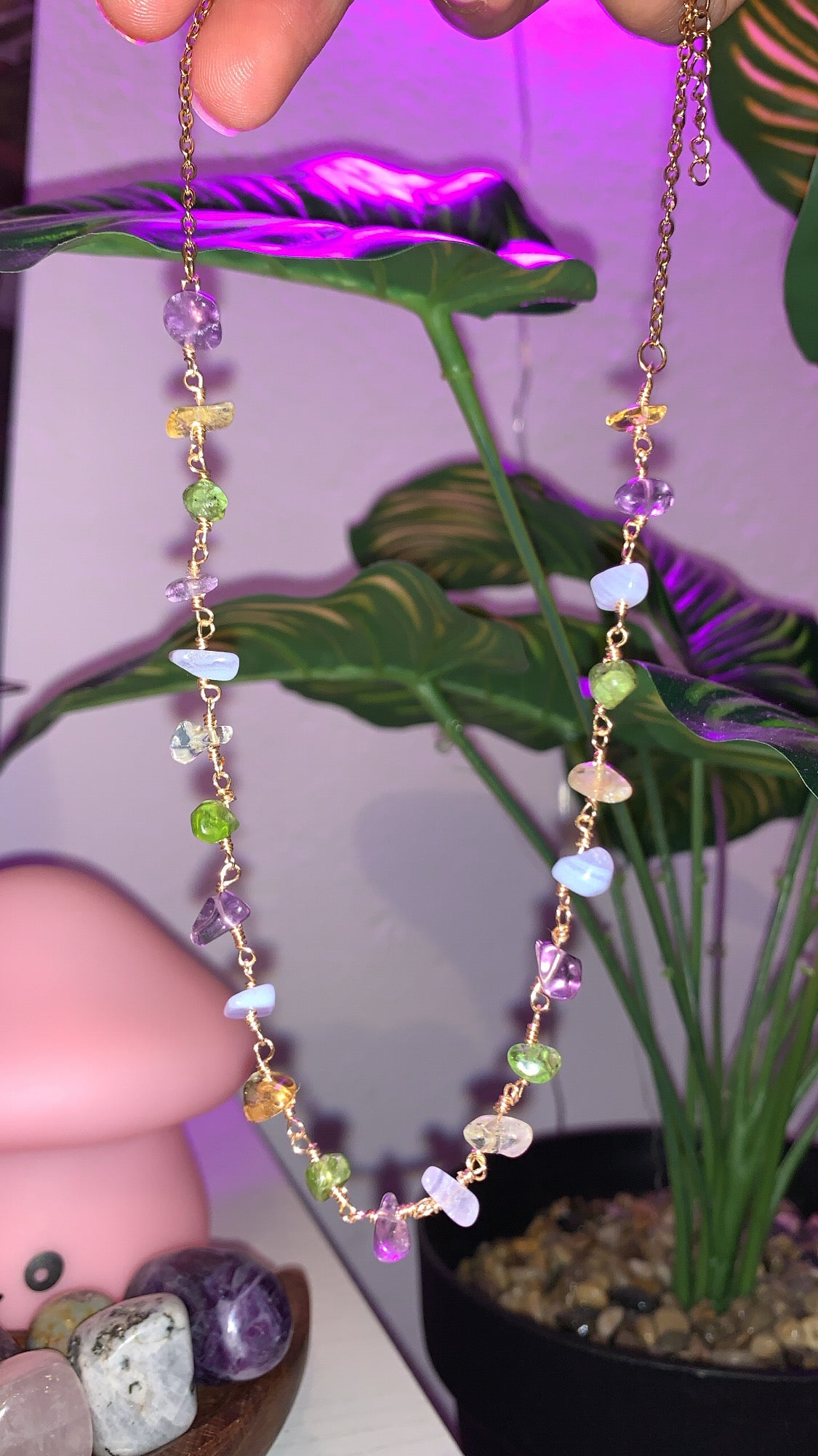 Aurora necklace features gemstone properties for natural healing. This necklace is crafted with natural amethyst, citrine, blue lace agate and peridot.