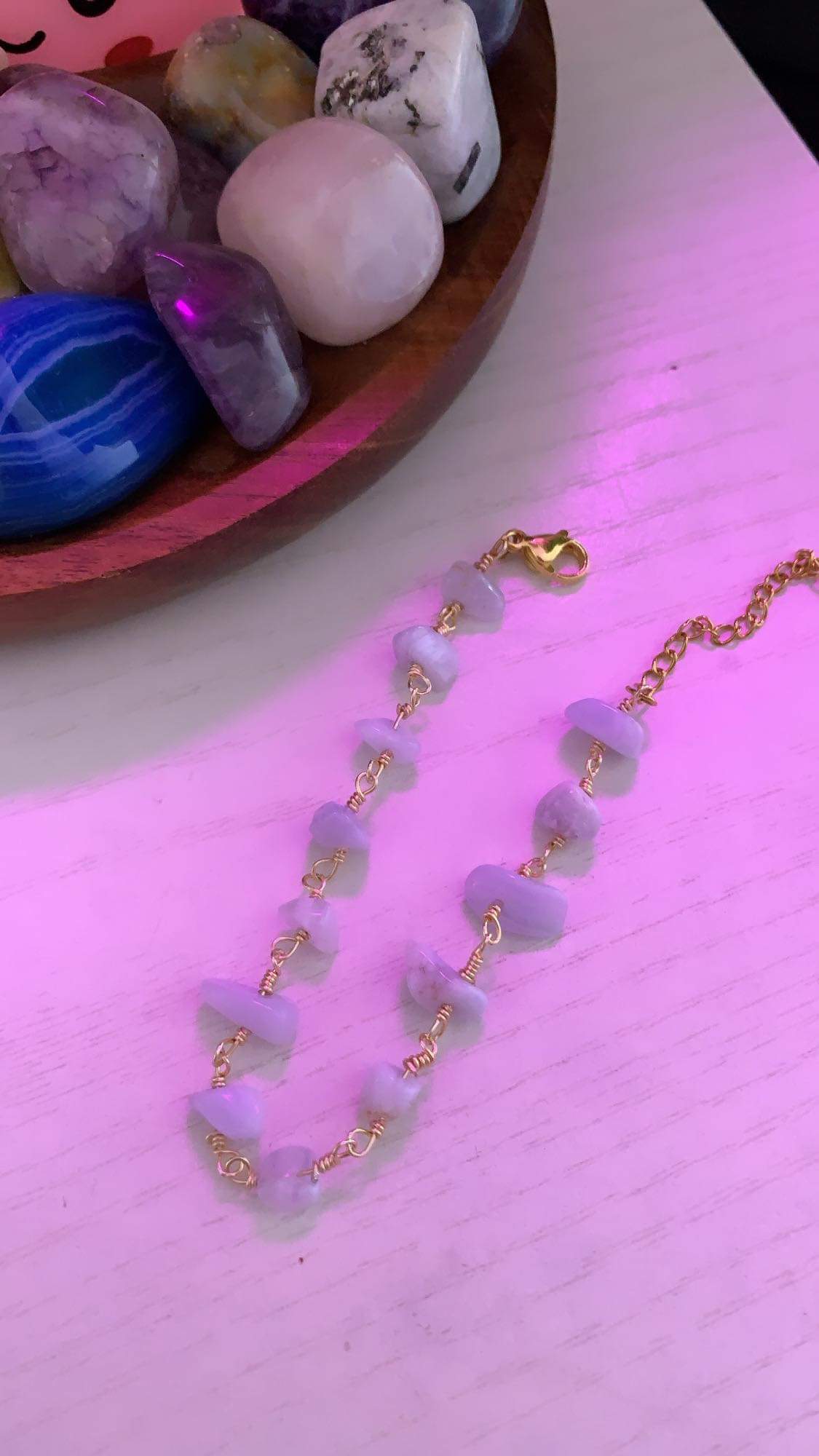 6 pulgadas, se extiende a 8 pulgadas. Cadena stainless steel con mini piedras blue lace agate.