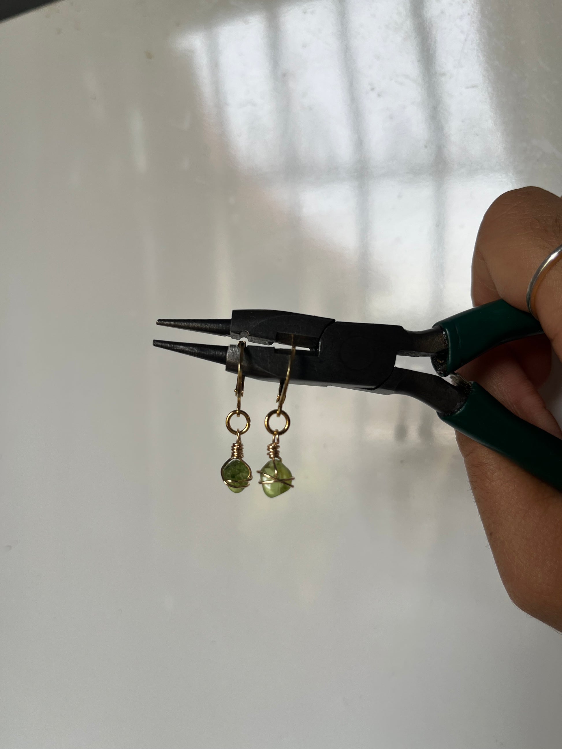 Pantallas oro stainless steel alambrados a mano con alambre non tarnish. Piedras peridot pequeñas de alta calidad.
