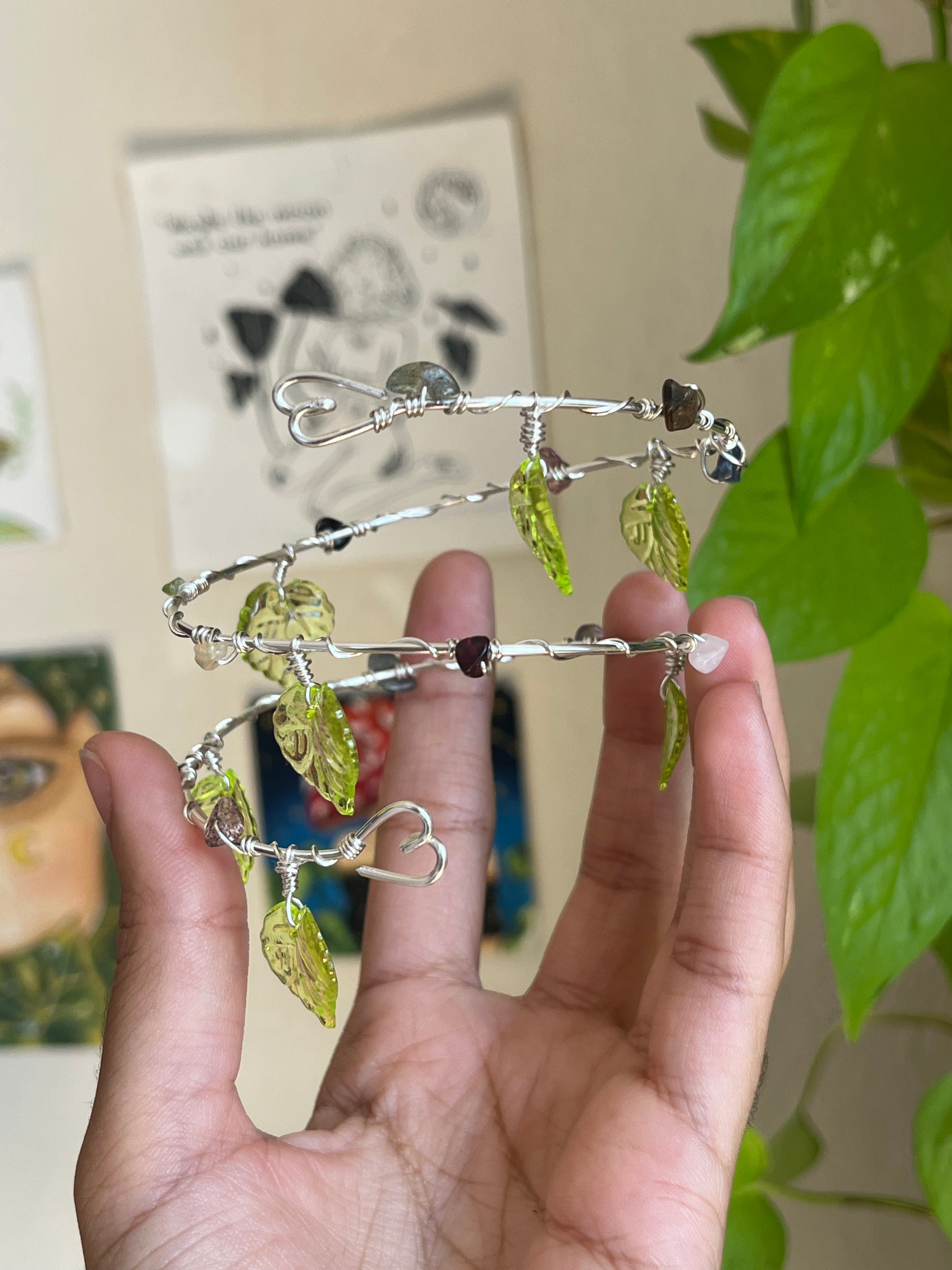 This arm cuff is handmade with non-tarnish wire, adorned with delicate green glass leaves and natural quartz crystals. Inspired by the whispers of the forest and the ethereal energy of fairies, it wraps softly around your skin like an enchanted vine.